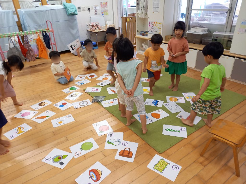 まずはカルタあそびです。3歳児クラスのはなぐみでは、「りんご」「ふうせん」のような単語の読み札と、ひらがなとイラストが描かれた大きな絵札のカルタを使用して遊びました。ひらがなを読むことができる子どもは、「わたしが読む!」と率先して読み手になっています。札を取る時はひらがなではなく、イラストを見て取っているのですが、終わった後にじっと札を見てひらがなを見る姿が見られます。遊びの中で文字に親しみ、少しずつ興味を持ってほしいと思います。