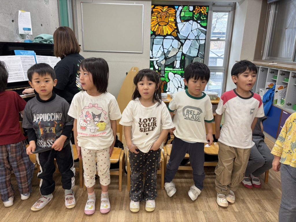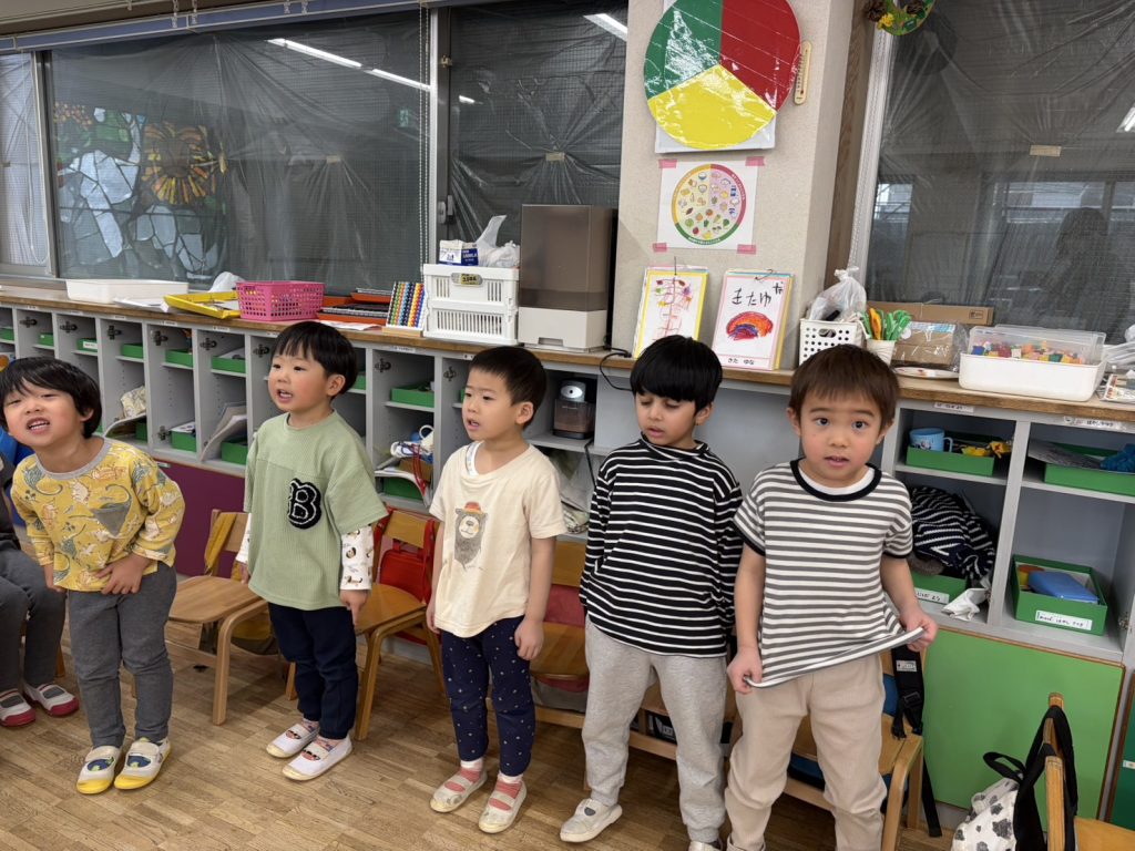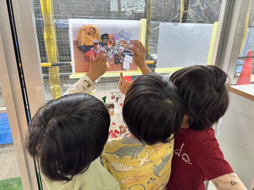 その後は、もし園で地震が起きた時に備えて、避難バッグには何を入れておくとよいかを子どもたちと話し合いました。水や保存食、ライトなどを挙げながら、命を守るために必要なものを一生懸命考える様子が印象的でした。みんなで話した後には『しあわせ運べるように』の歌を、震災で亡くなられた方への思いや、これからもみんなが安全に過ごせるようにという願いを込めて、歌う姿が見られました。
